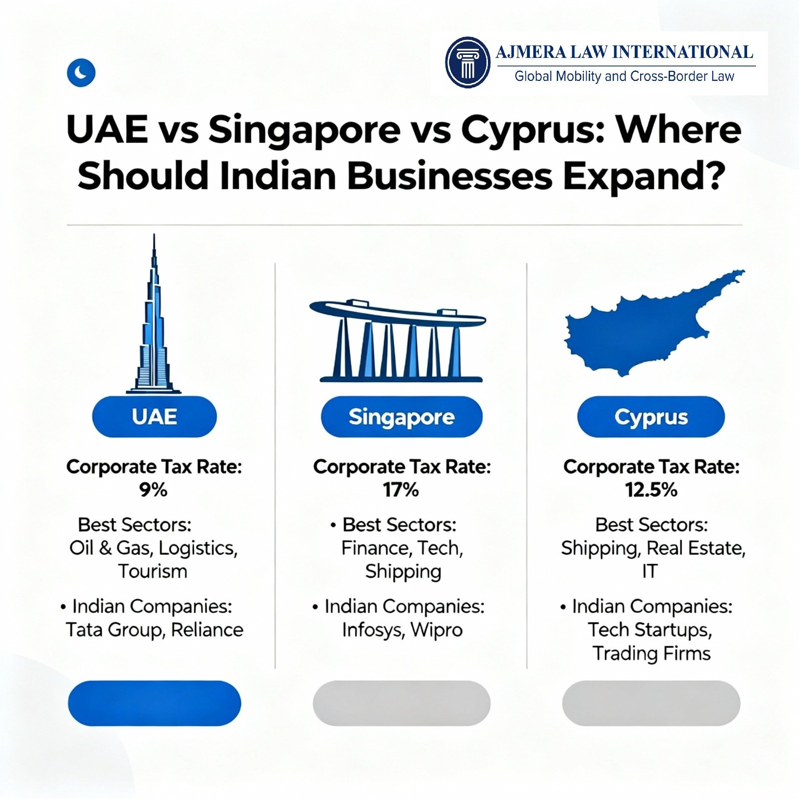 UAE is best for Indian corporates in trade, logistics, energy, and retail; Singapore leads in tech, finance, and APAC headquarters; Cyprus is the EU gateway for holding, IP, fintech, and is increasingly favored for EU market entry and family office structuring.